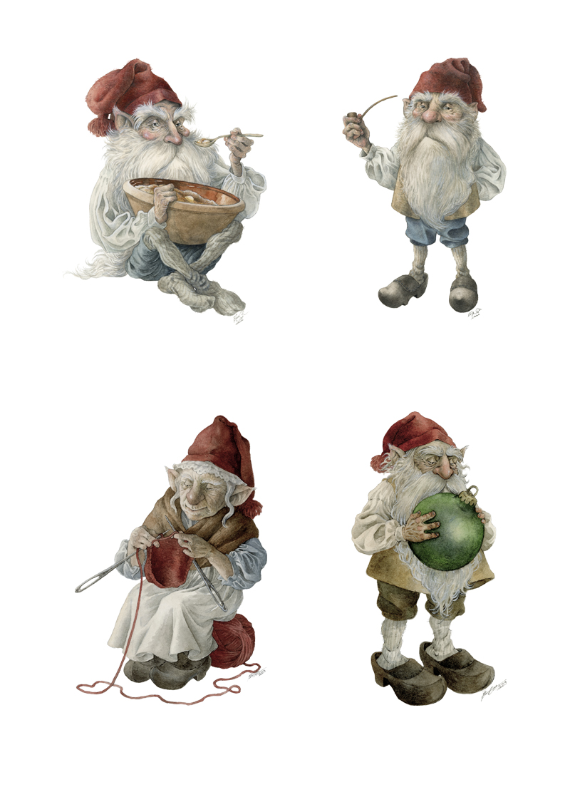 Eksempler på nissemotiver illustreret til julekort solgt hos Tibberup Høkeren. Der er seks forskellige nissemotiver i alt.